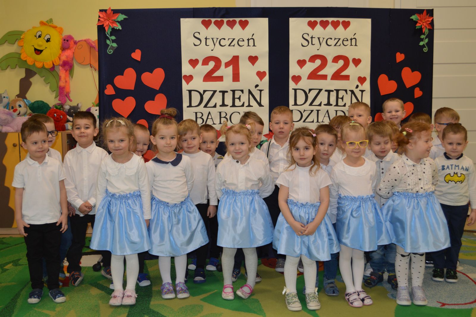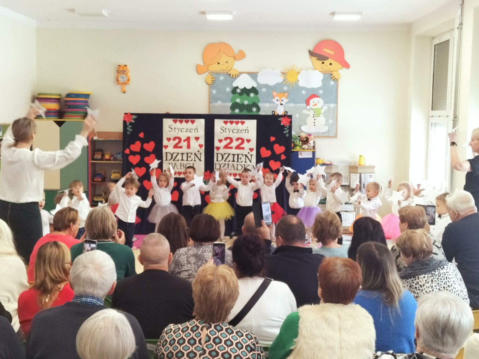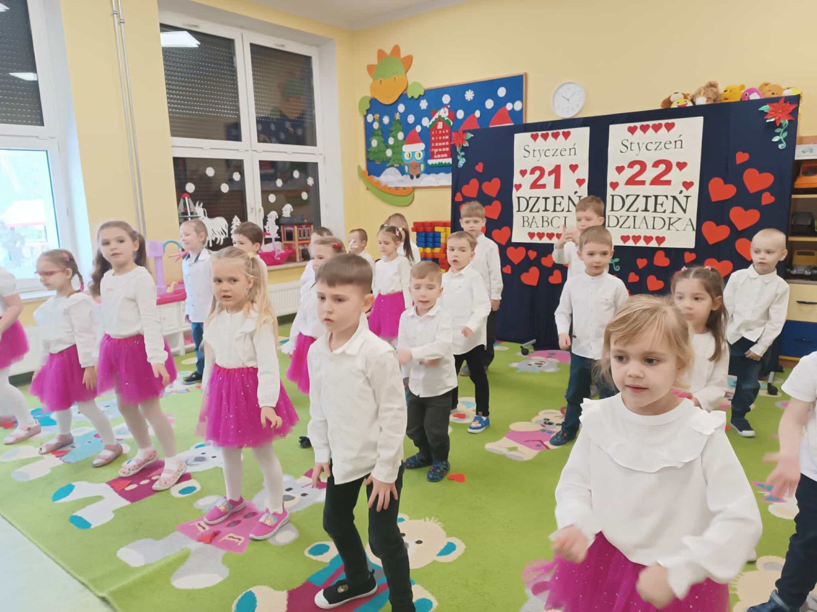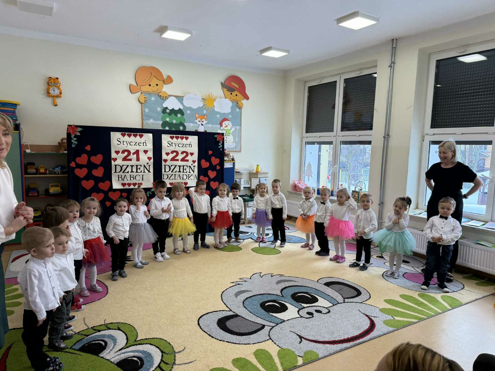 Trzy- i czterolatki z grupy II „Żabki” recytowały wiersze oraz śpiewały piosenki: „Wiwat Babciu, wiwat Dziadku”, „Życzenia dla Babci i Dziadka” (sł. i muz. Andrzej Zagajewski) oraz „Taniec klaskaniec” Z. M. Tomaszewskiej. Mali artyści grali na klawesach i marakasach,   a także zatańczyli energetycznego rock and rolla. Na zakończenie dzieci wręczyły Babciom   i Dziadkom własnoręcznie przygotowane upominki oraz złożyły serdeczne życzenia.