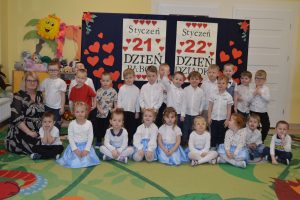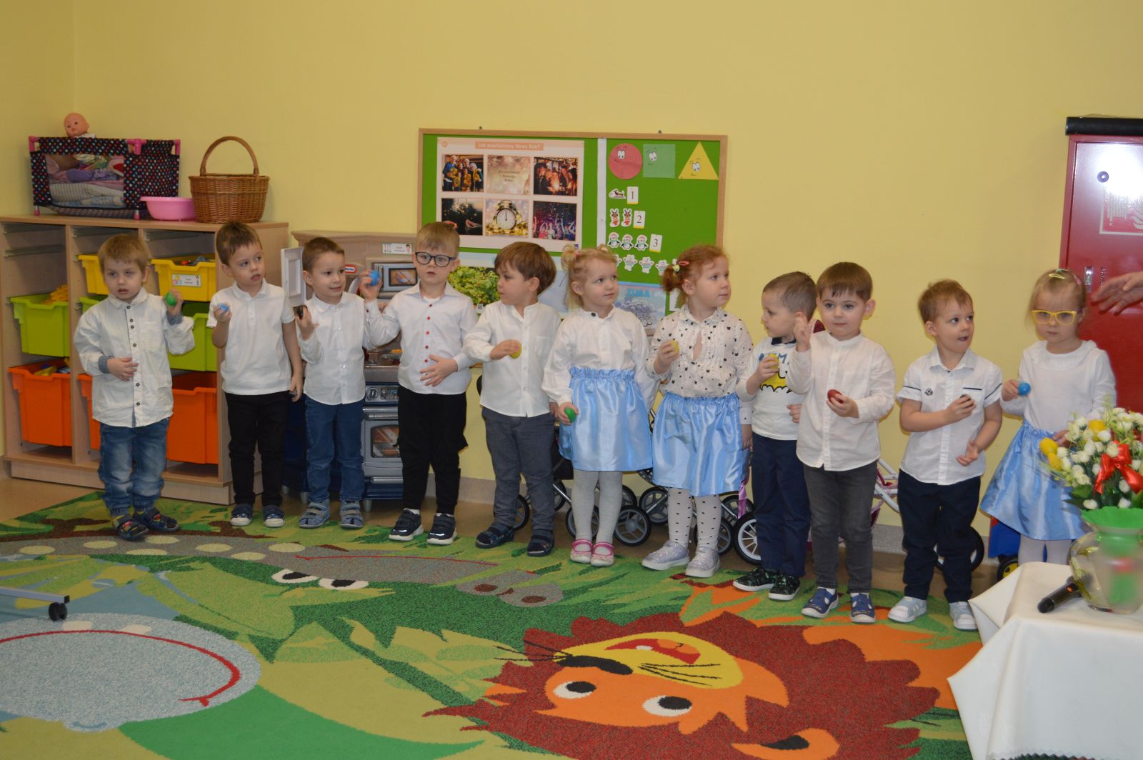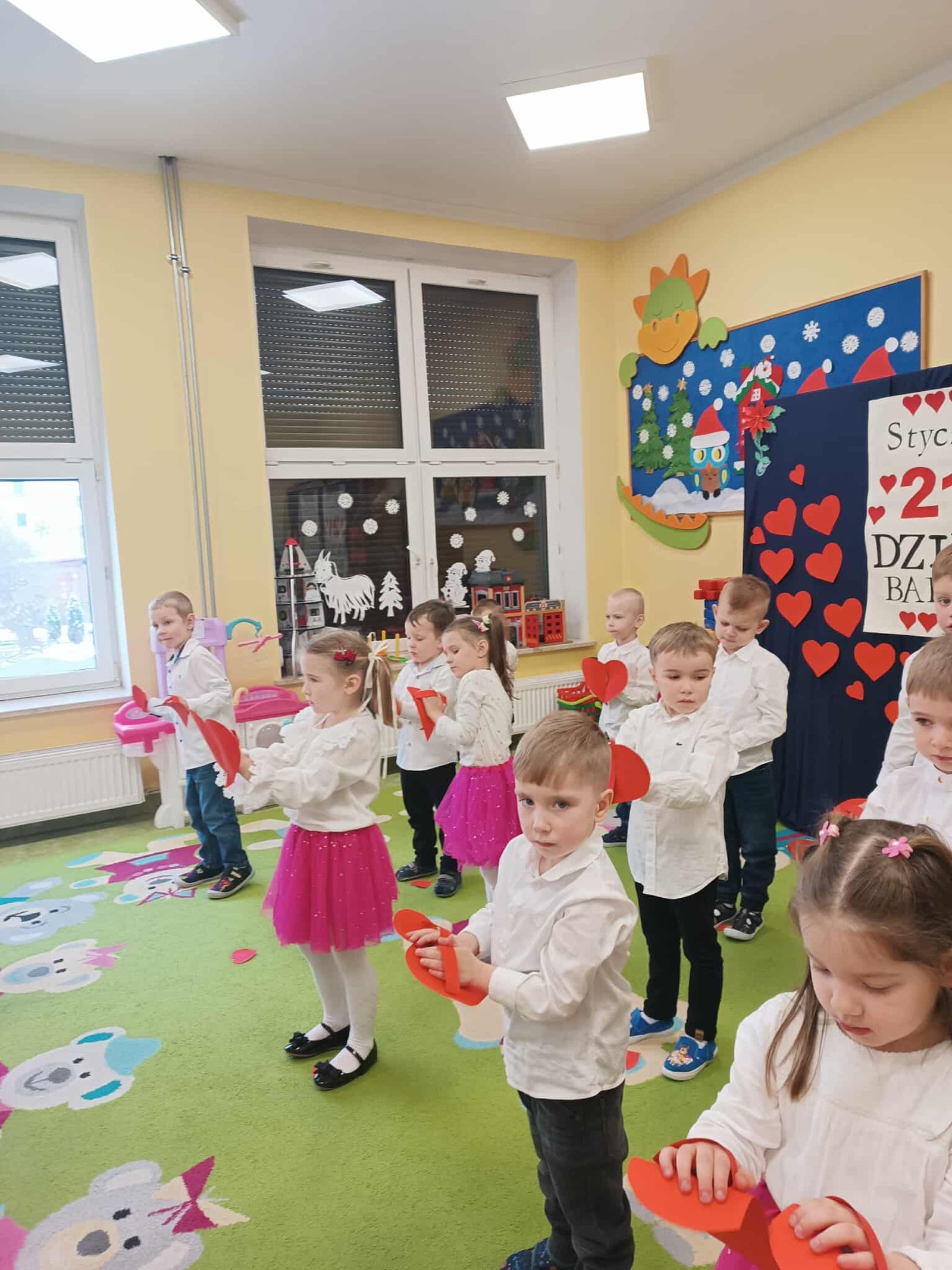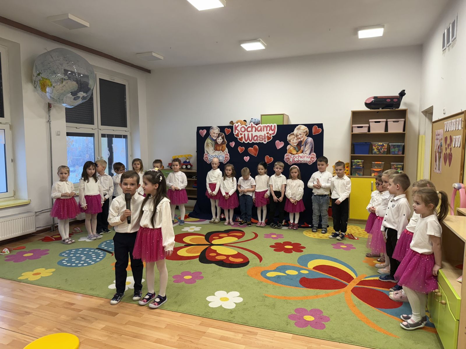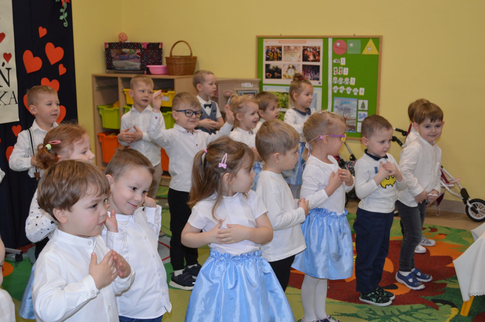 Trzy- i czterolatki z grupy II „Żabki” recytowały wiersze oraz śpiewały piosenki: „Wiwat Babciu, wiwat Dziadku”, „Życzenia dla Babci i Dziadka” (sł. i muz. Andrzej Zagajewski) oraz „Taniec klaskaniec” Z. M. Tomaszewskiej. Mali artyści grali na klawesach i marakasach,   a także zatańczyli energetycznego rock and rolla. Na zakończenie dzieci wręczyły Babciom   i Dziadkom własnoręcznie przygotowane upominki oraz złożyły serdeczne życzenia.