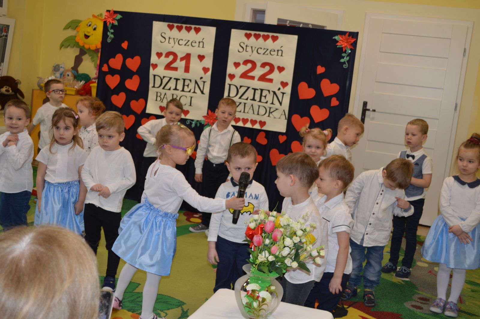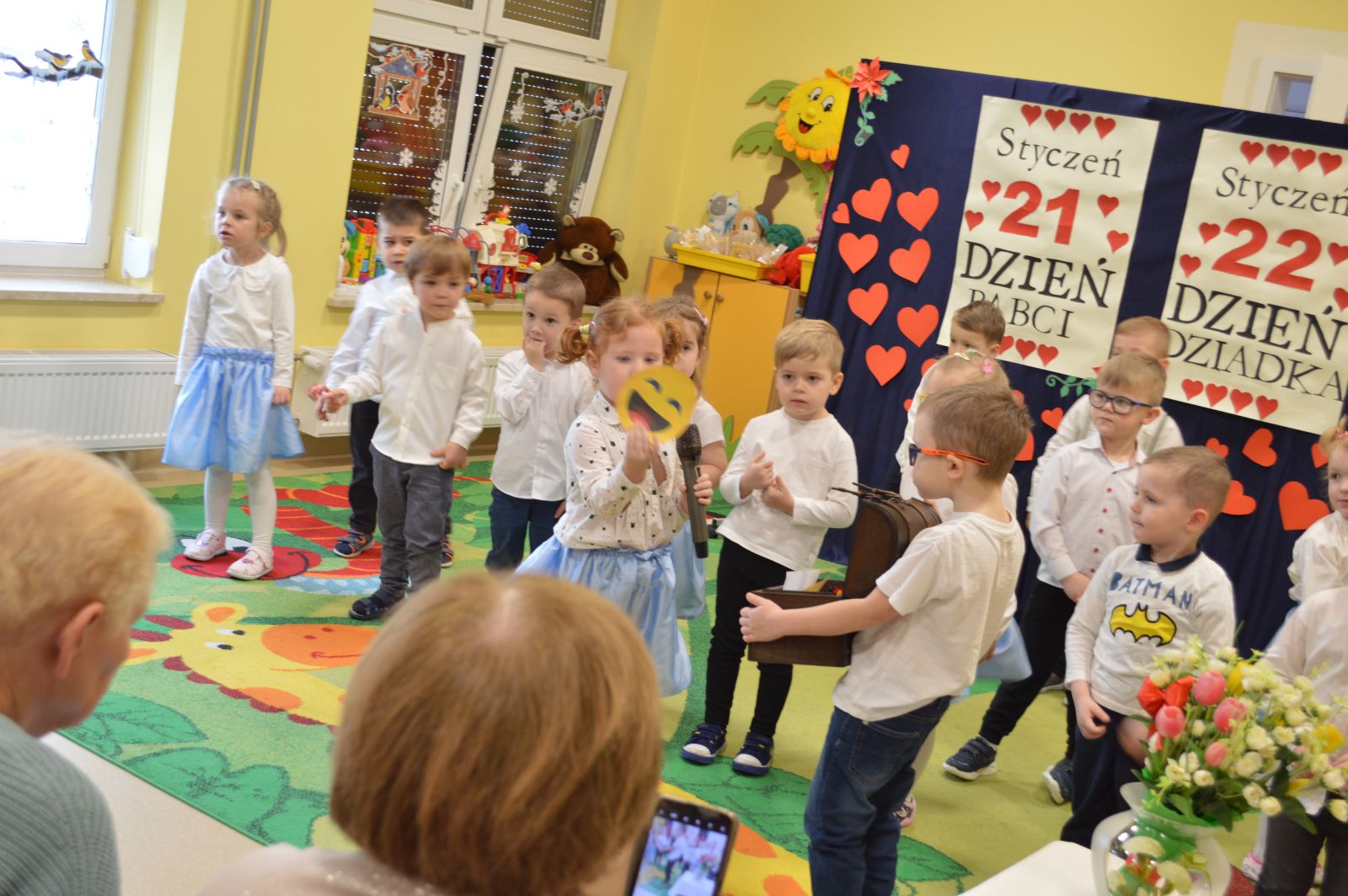 Dzieci z grupy IV „Pingwinki” recytowały wiersze oraz śpiewały piosenki „Poleczka dla Babci i Dziadka” oraz „Dla dziadka i babci prześlę dziś buziaczki”. Zaprezentowały także dwa tańce – do piosenek „Cudny moment” oraz „Super taniec dla babci i dziadka”.