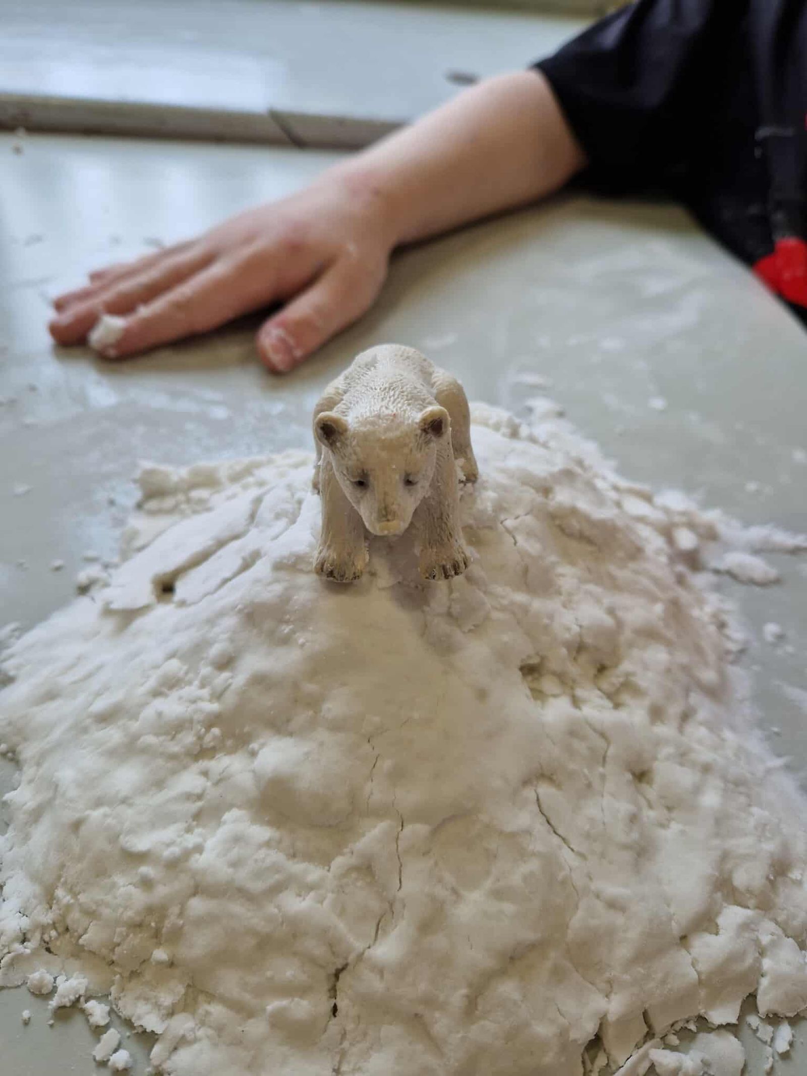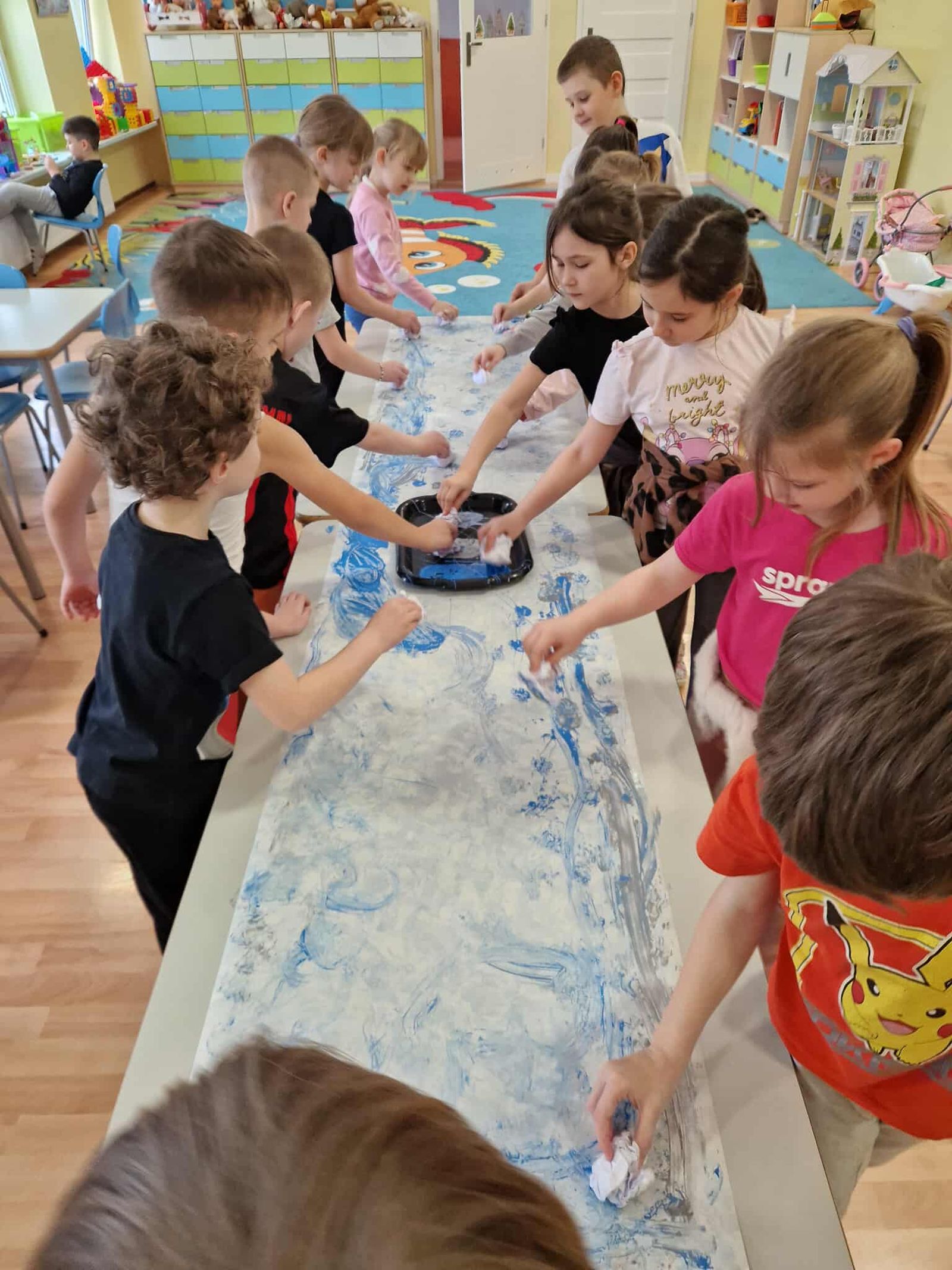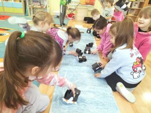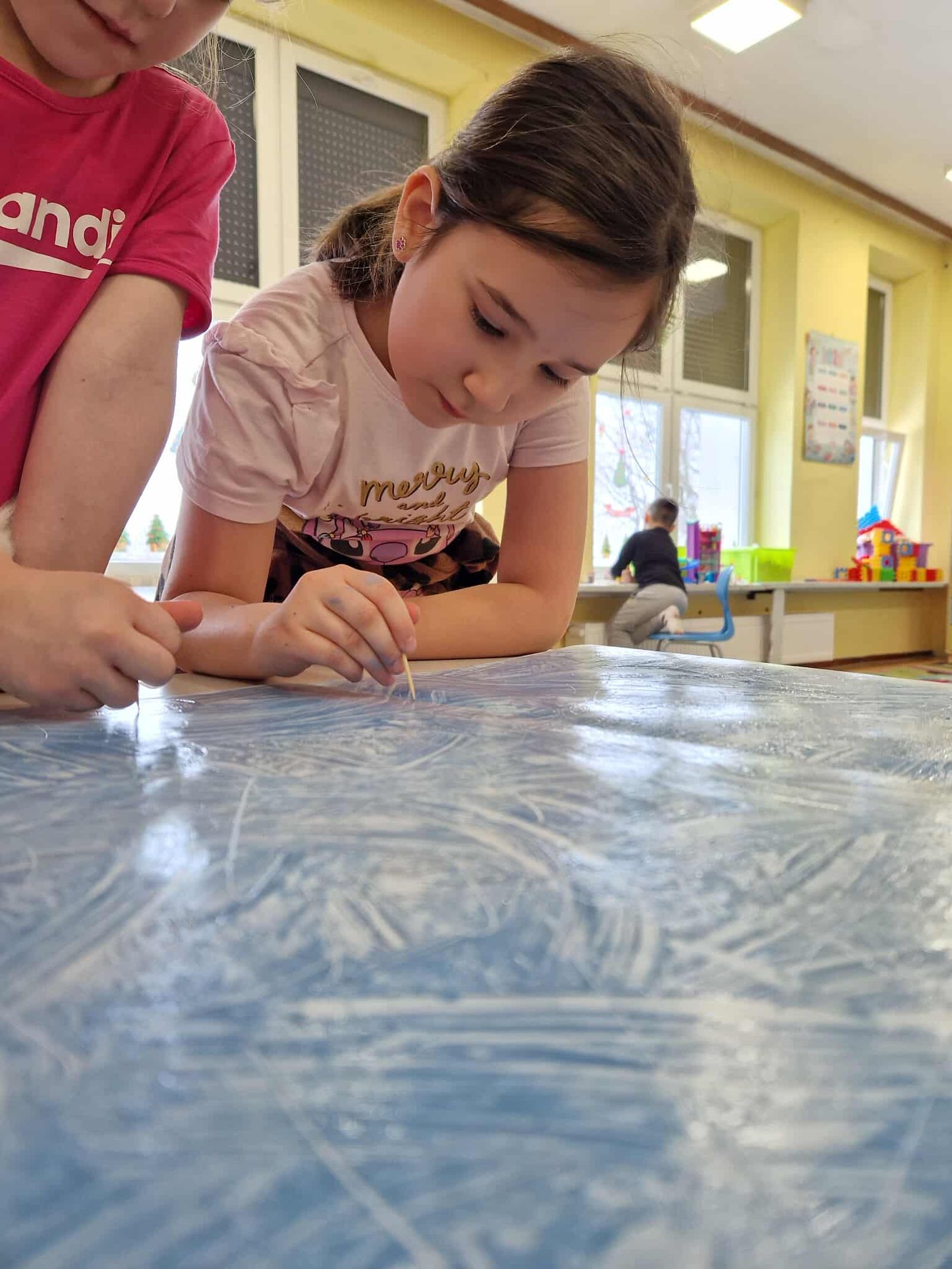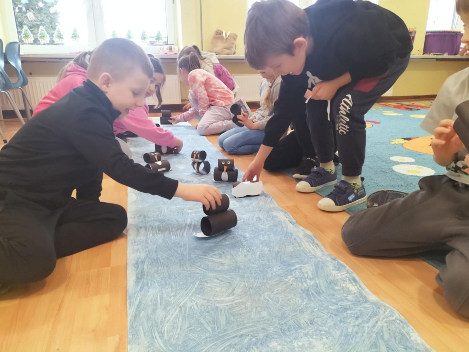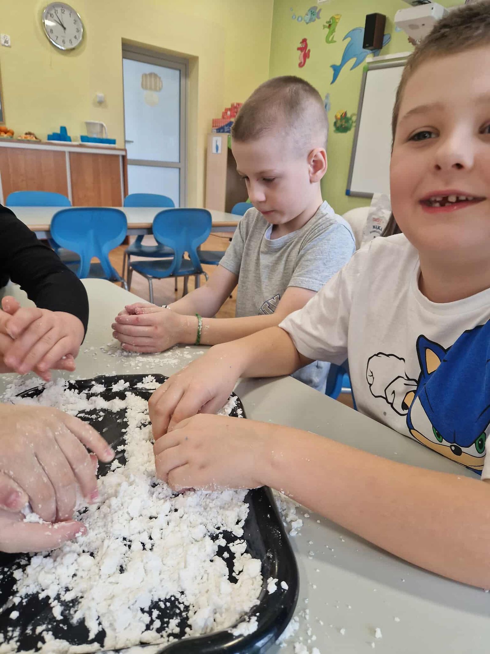 Podczas zajęć dzieci poznawały charakterystyczne cechy zimowej pogody, rozmawiały o śniegu, lodzie oraz zwierzętach zamieszkujących chłodne rejony świata. Wspólnie odkrywaliśmy, jak powstaje lód i dlaczego śnieg jest biały, rozwijając przy tym ciekawość poznawczą i umiejętność zadawania pytań.