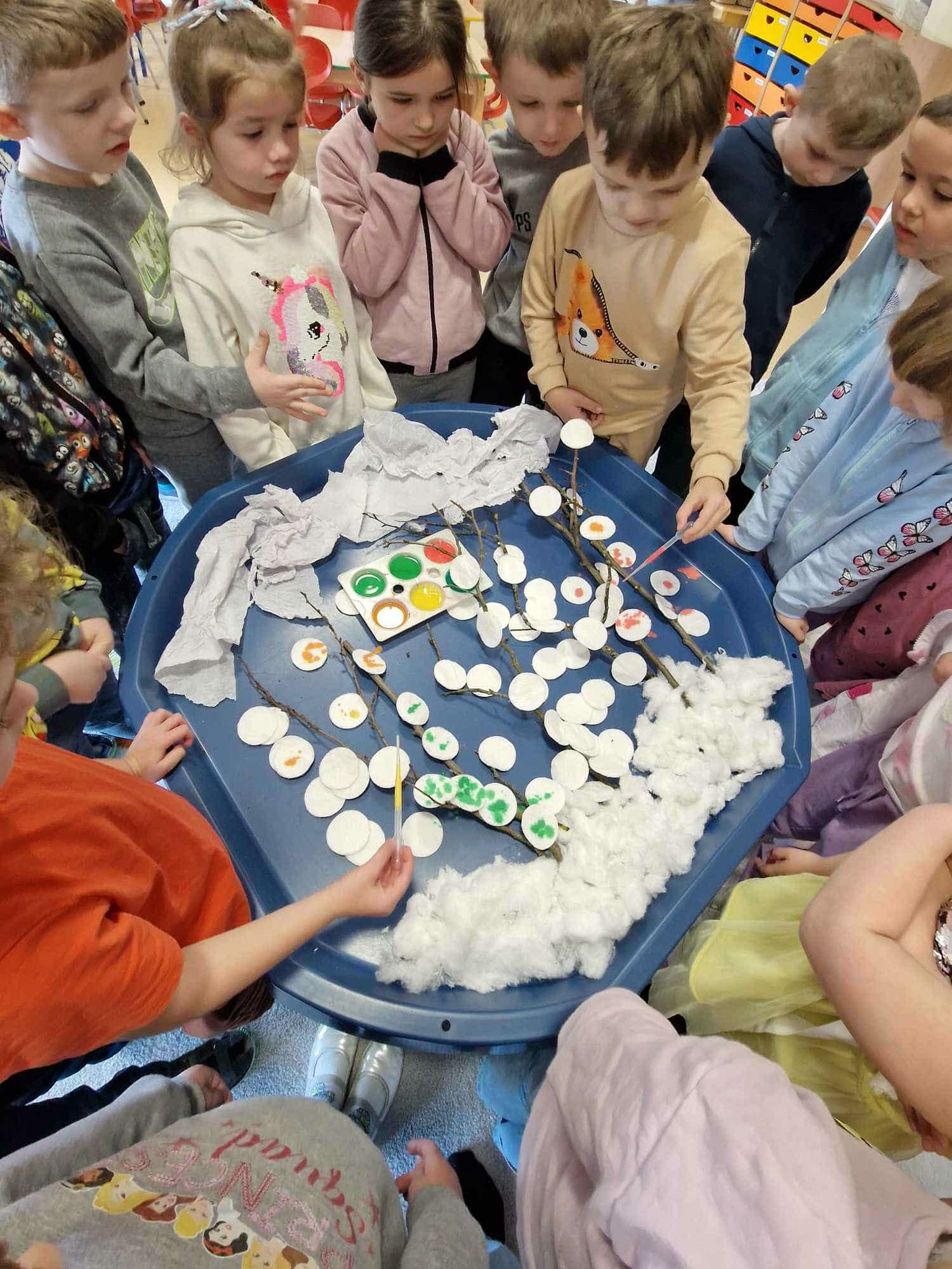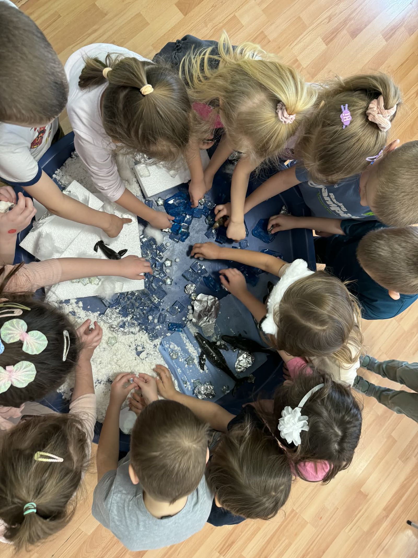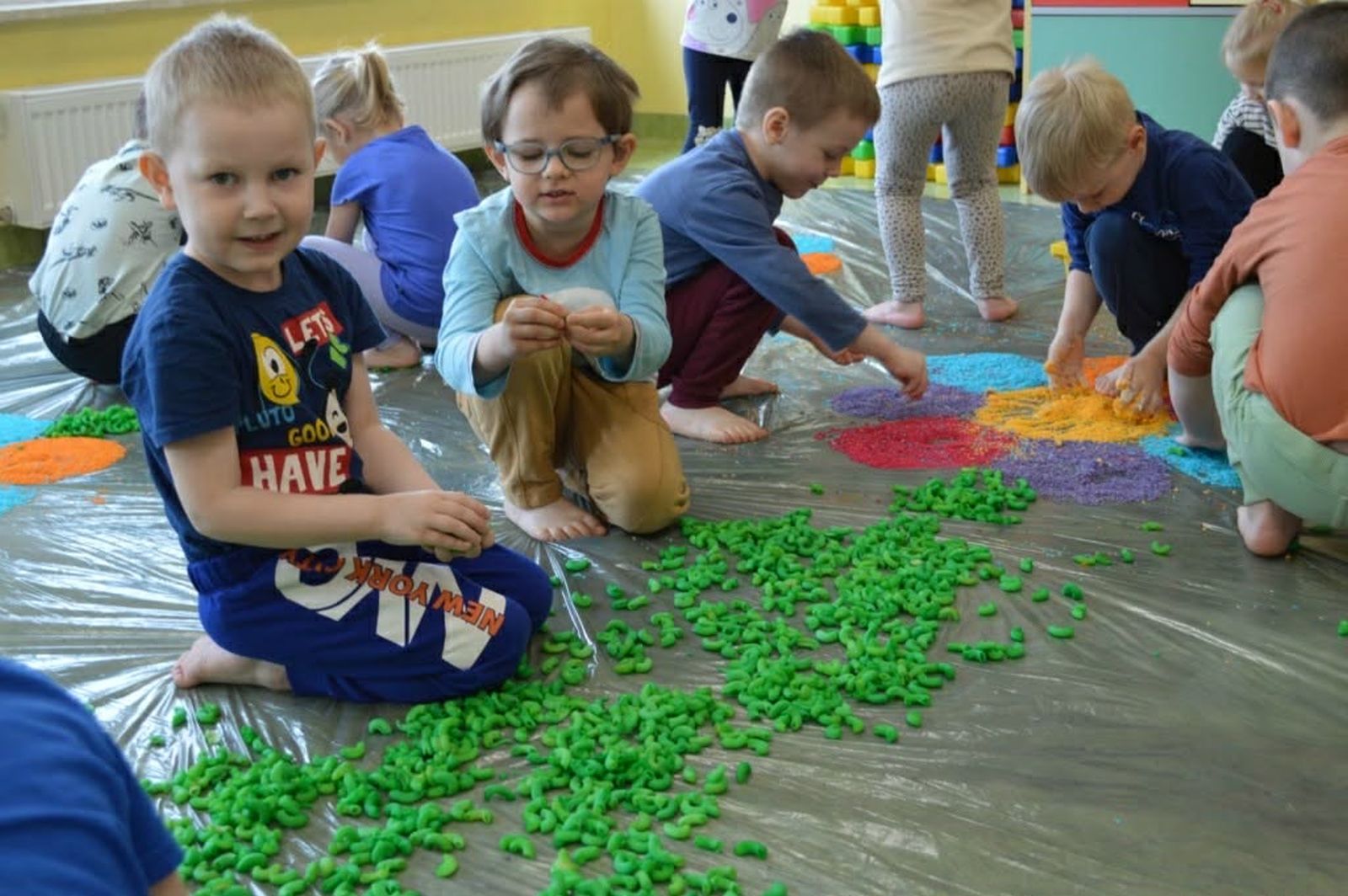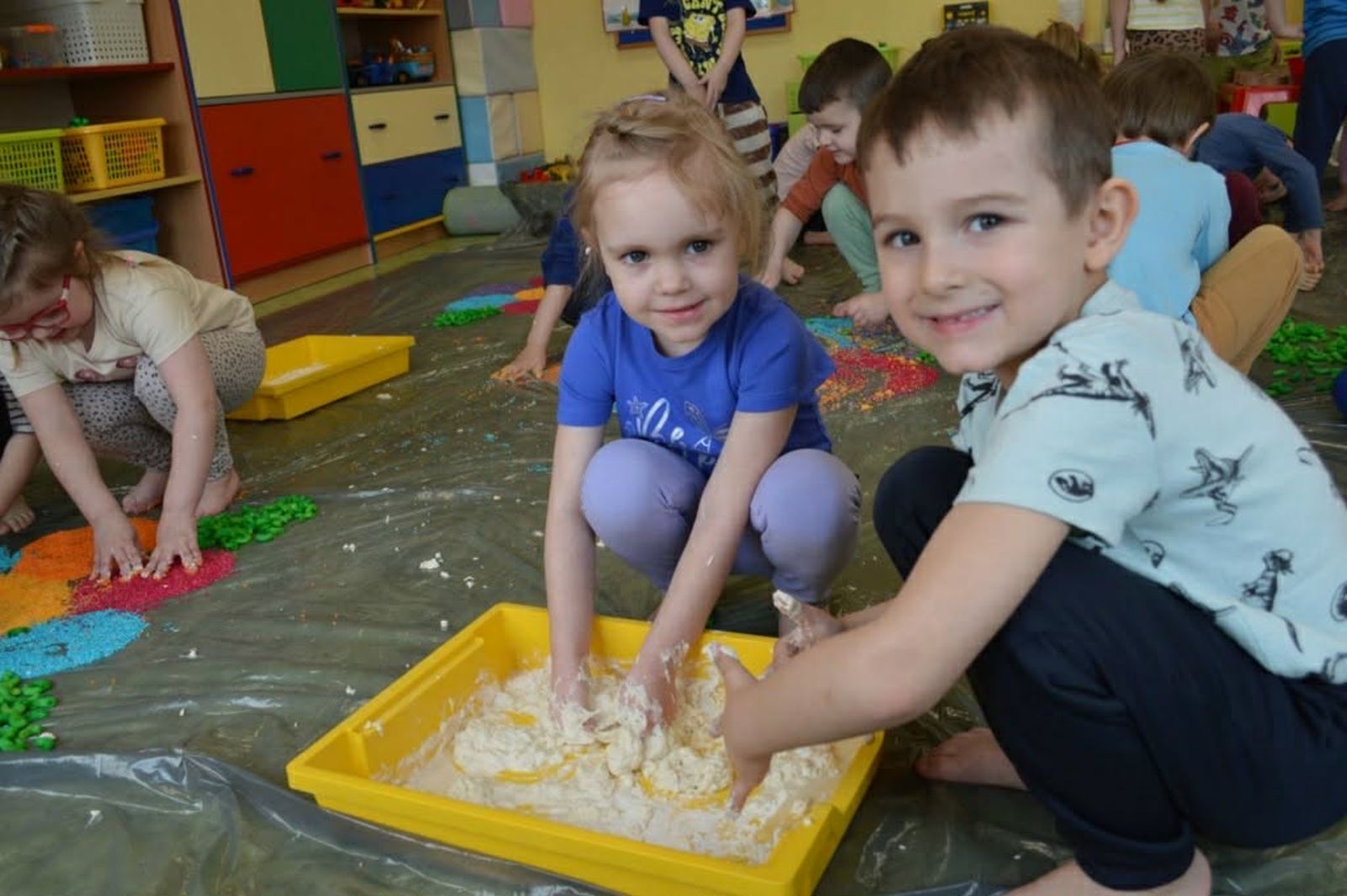W trakcie zajęć dzieci w naszym przedszkolu mają możliwość swobodnego eksperymentowania z różnorodnymi materiałami, takimi jak: piasek kinetyczny, masa solna, galaretka, ryż, kasza, woda, lód, śnieg, pianka do golenia czy naturalne materiały (liście, szyszki, kamienie). Dzieci ugniatają, przesypują, przelewają, mieszają i porównują struktury oraz temperaturę.