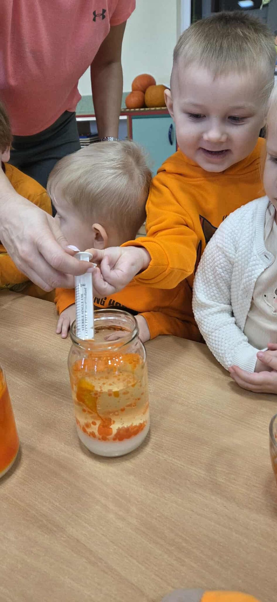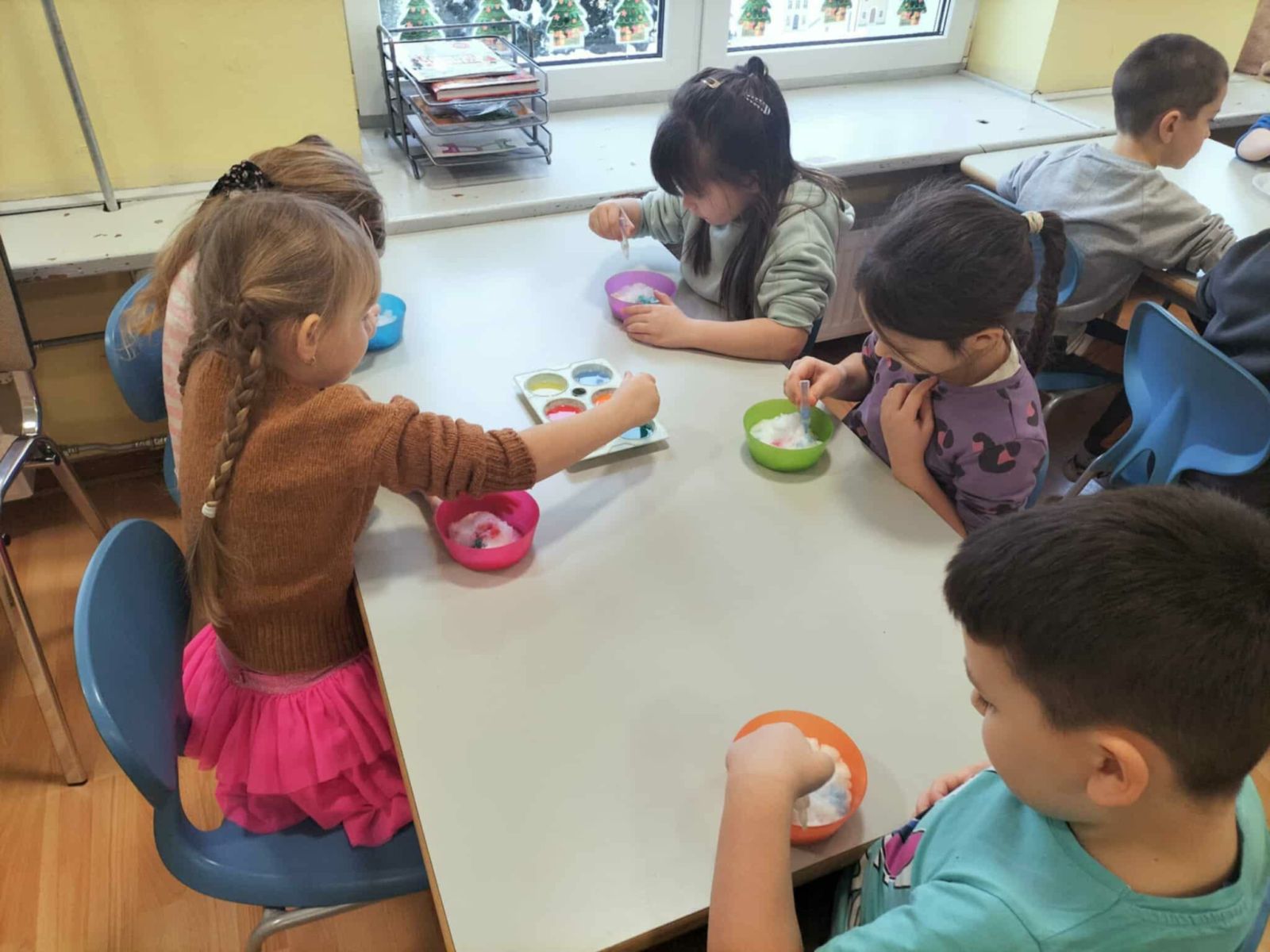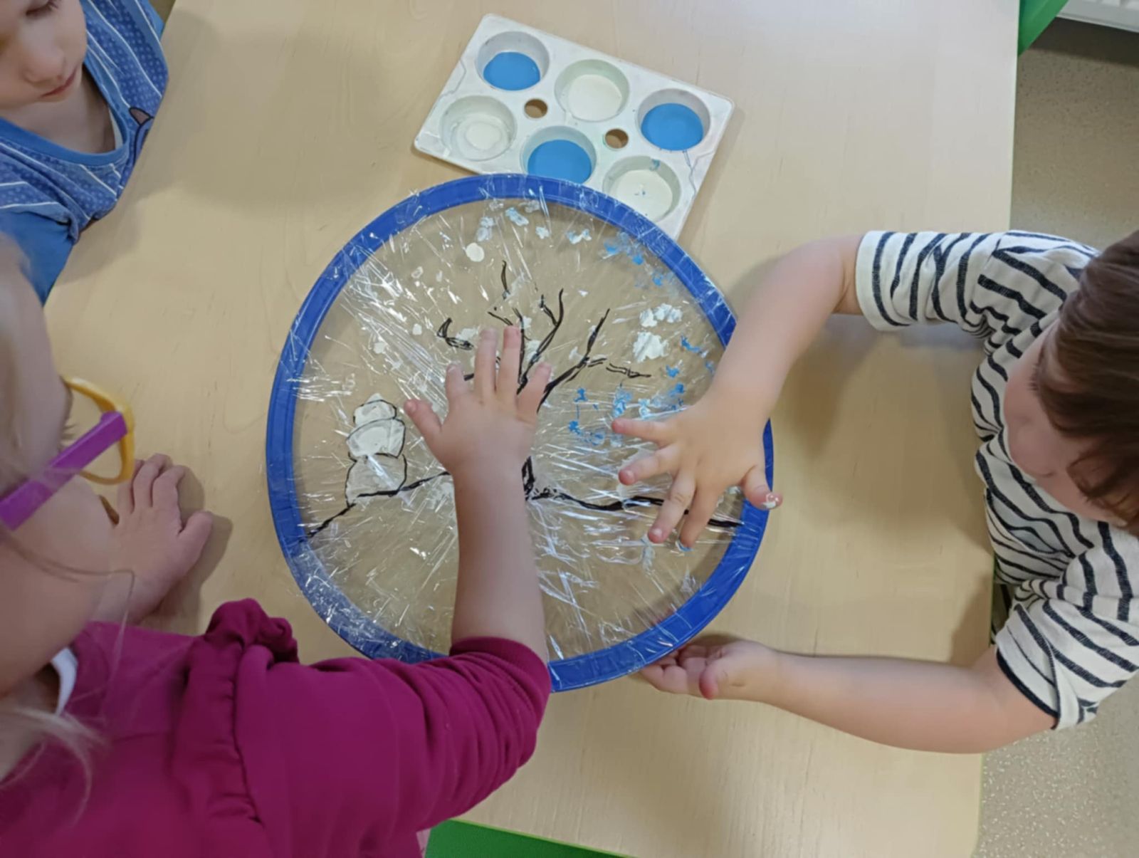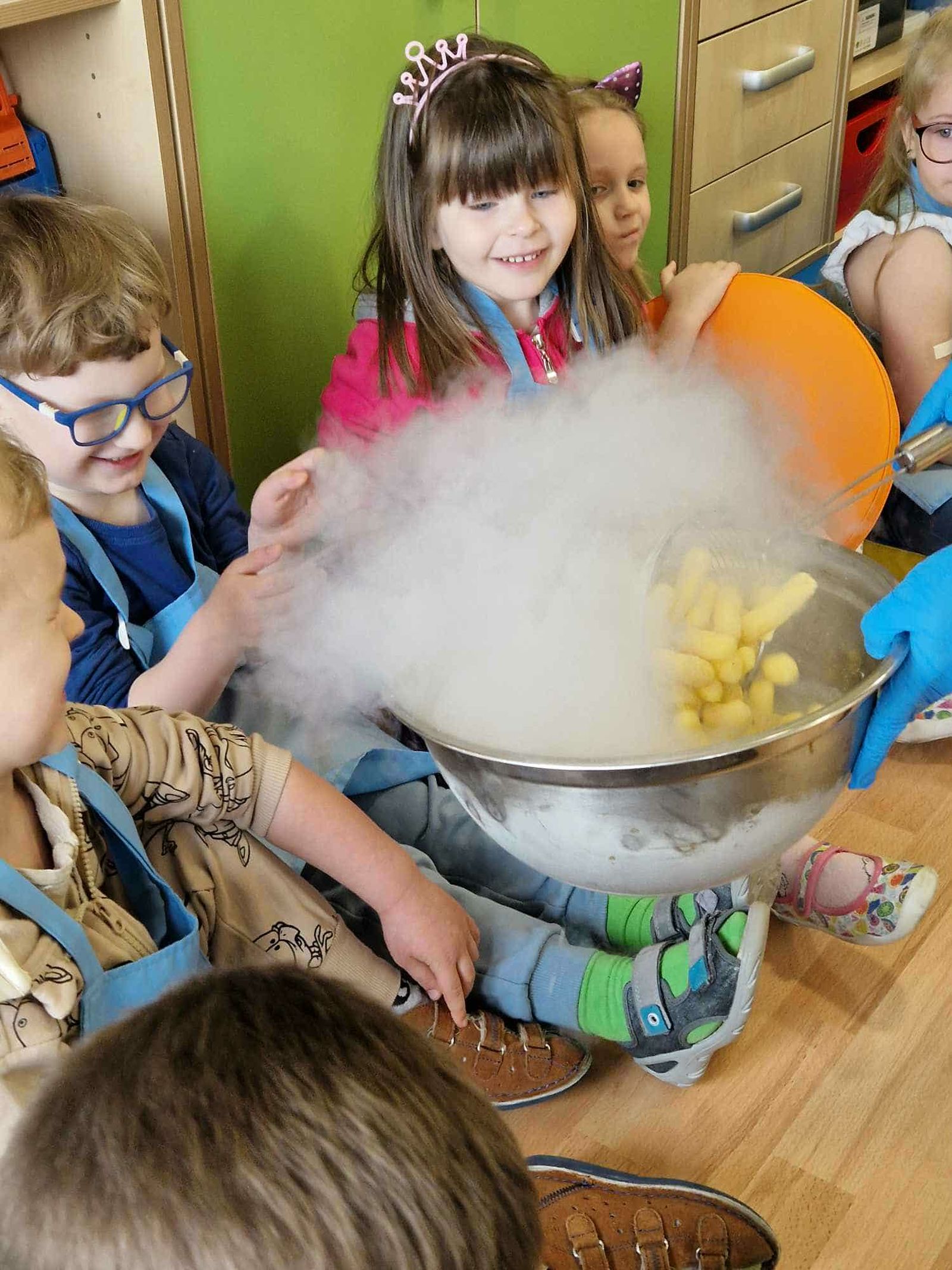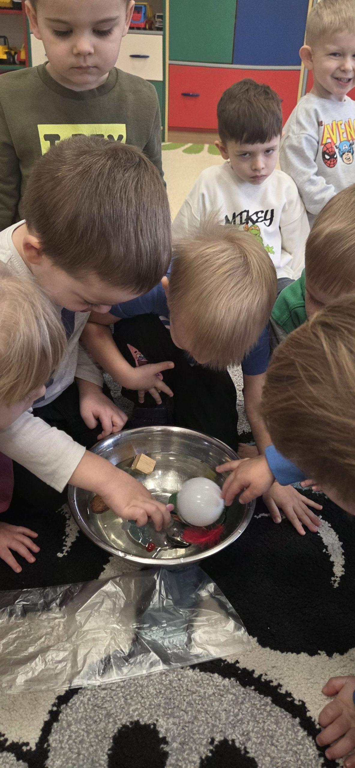 W trakcie zajęć dzieci w naszym przedszkolu mają możliwość swobodnego eksperymentowania z różnorodnymi materiałami, takimi jak: piasek kinetyczny, masa solna, galaretka, ryż, kasza, woda, lód, śnieg, pianka do golenia czy naturalne materiały (liście, szyszki, kamienie). Dzieci ugniatają, przesypują, przelewają, mieszają i porównują struktury oraz temperaturę.