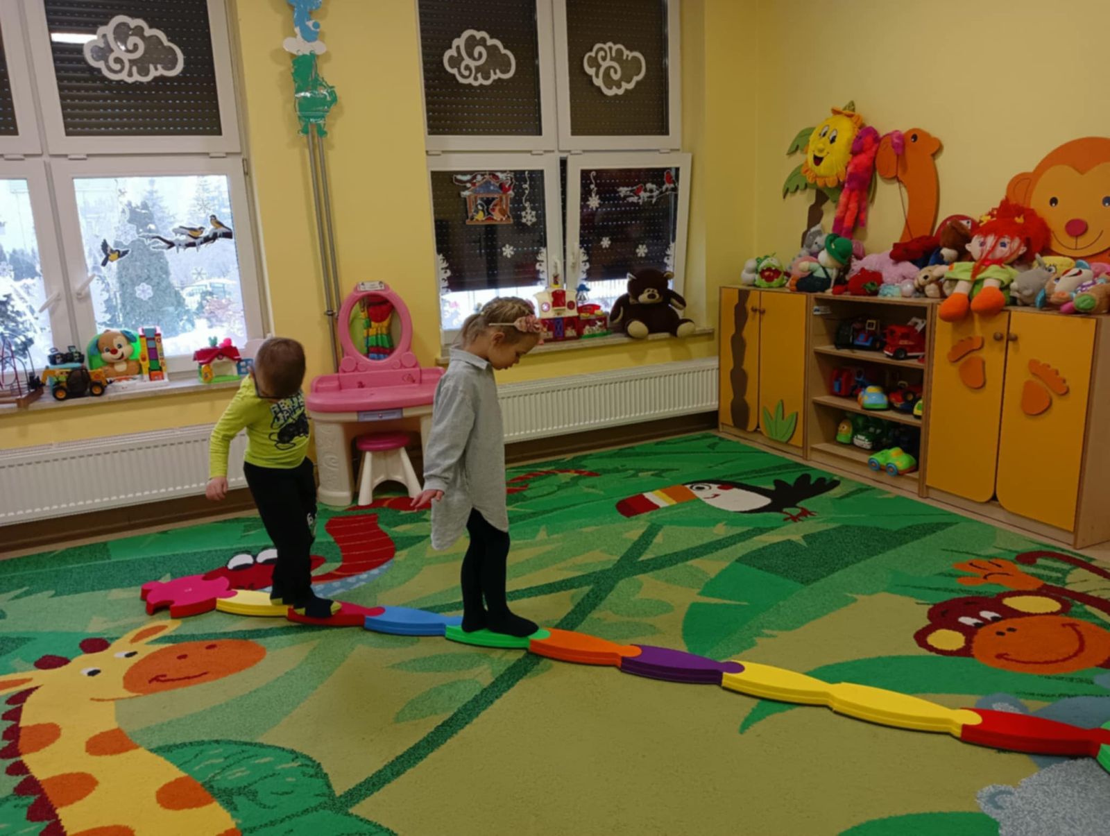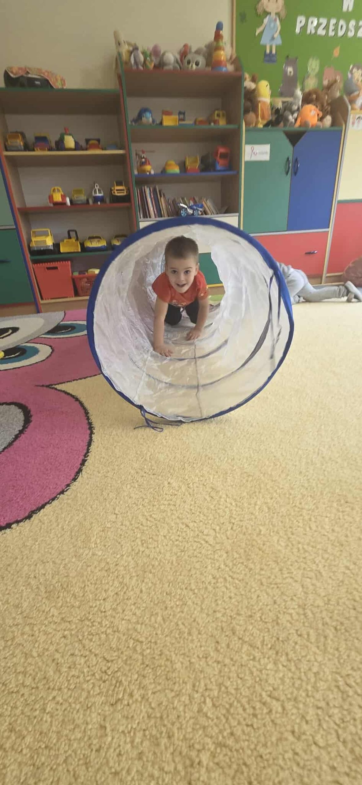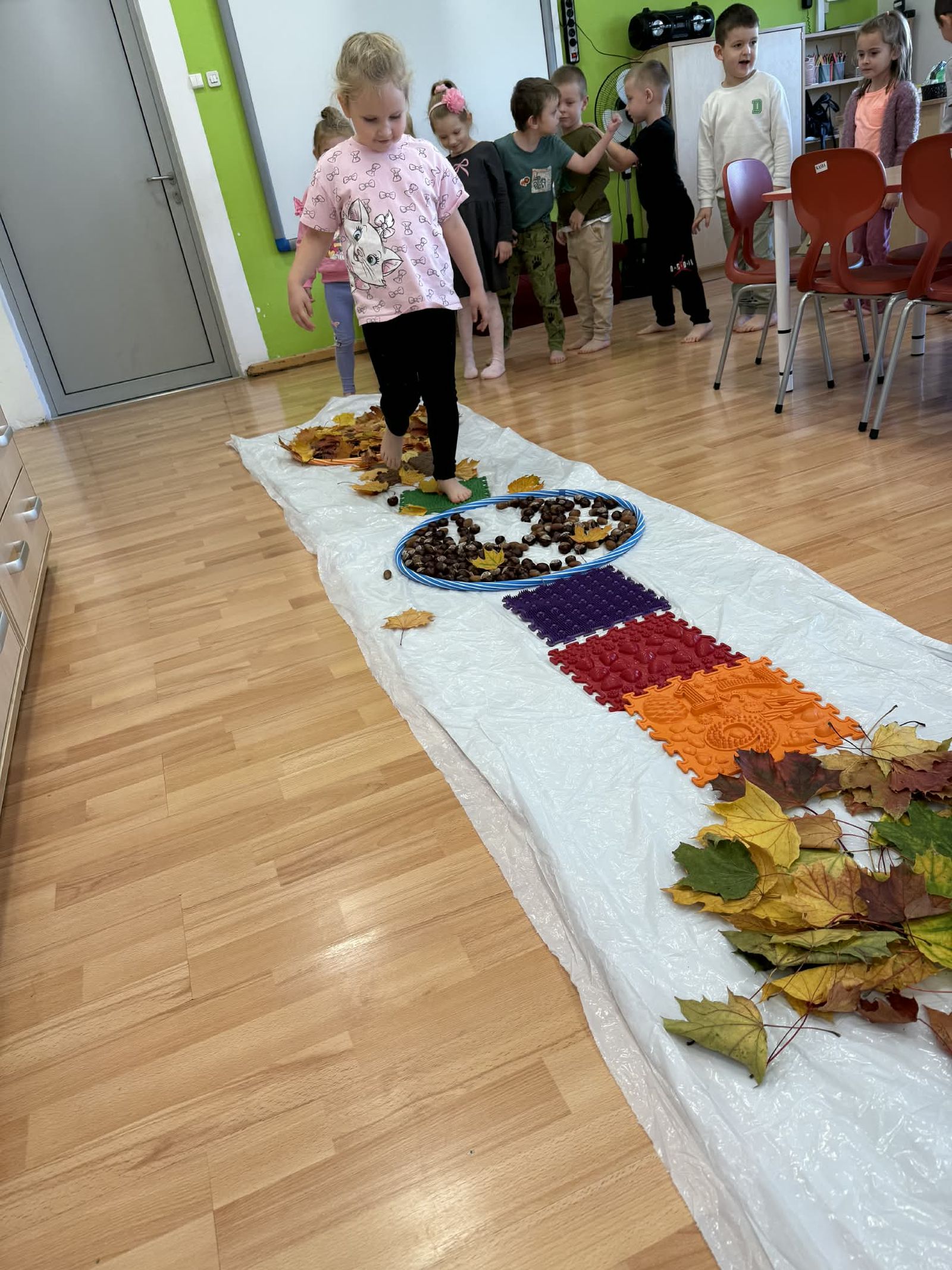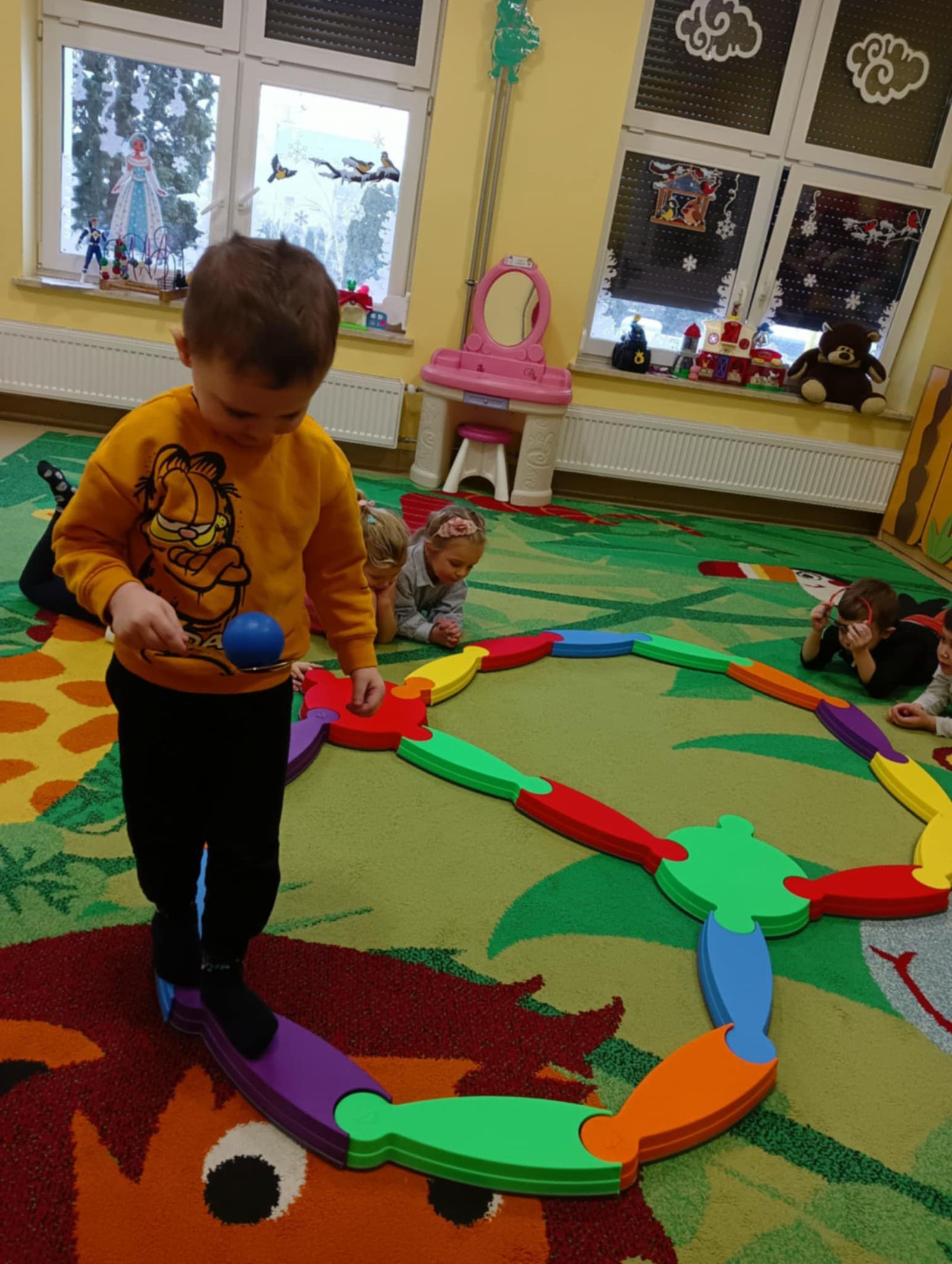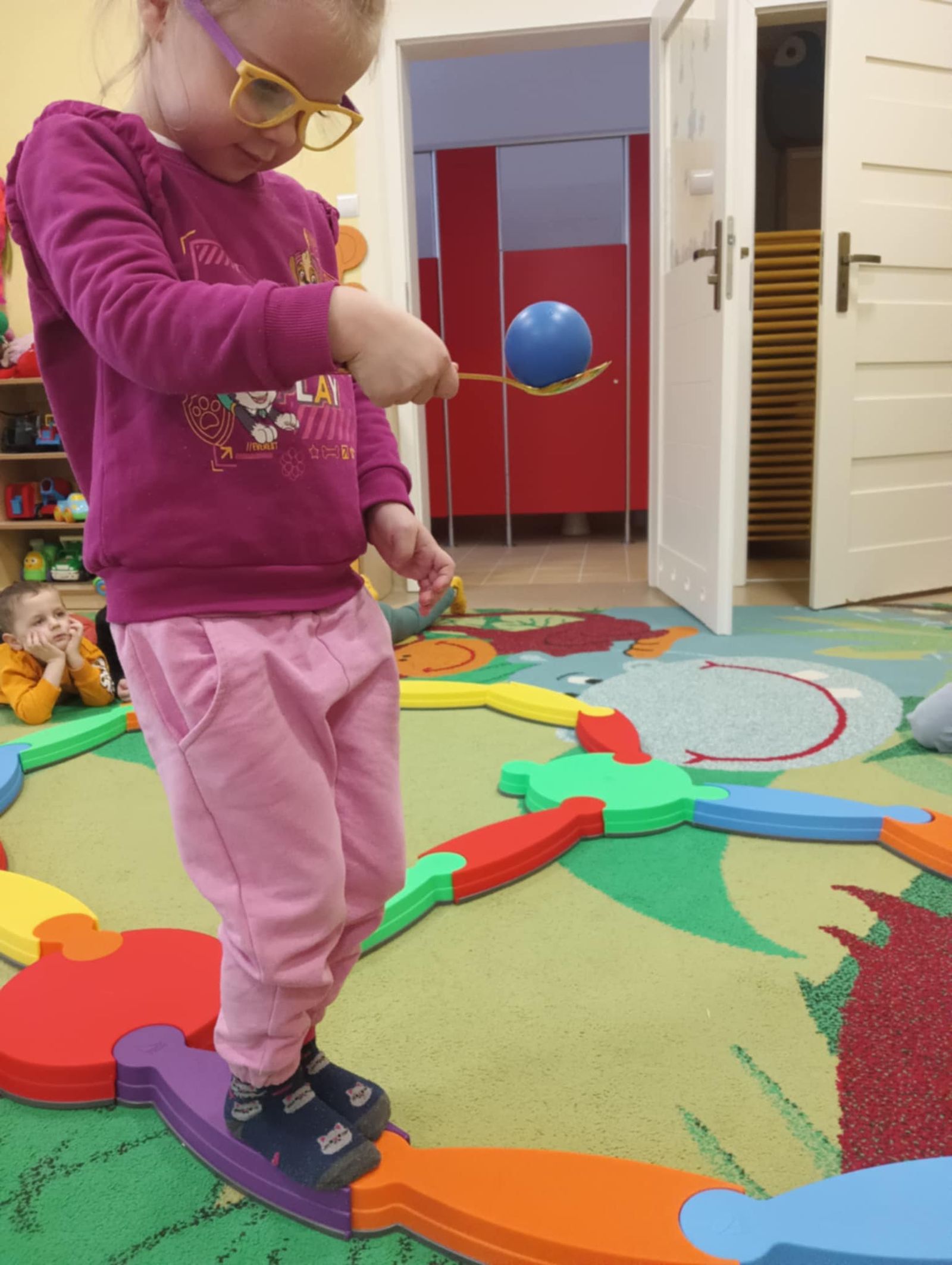 Ważnym elementem zajęć są również zabawy ruchowe stymulujące układ przedsionkowy i propriocepcję – tory przeszkód, zabawy z piłkami, ścieżki sensoryczne.